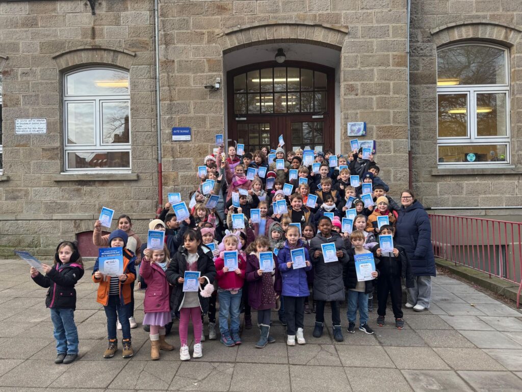Auf dem Schulhof erhielten dann ein paar Tage später alle Läuferinnen und Läufer ihre Urkunde, die sie unter dem Applaus ihrer Freundinnen und Freunde entgegennahmen.